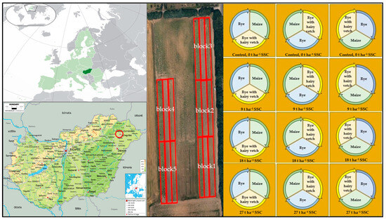 Based on the nitrogen (N) content of the SSC, the applied doses were 0, 9, 18, and 27 t ha−1. In 2021, the SSC treatment was conducted on October 7th, after the maize harvest. Other nutrient supply was not applied in the studied 2022–2024 period. The control plots received neither SSC nor chemical fertilizer. The SSC doses were ploughed into the 0–25 cm soil layer every 3rd year, in five replications (blocks). The experiment includes 60 plots (twelve in each block), and the size of each plot is 12 m × 19 m. The gross area of the experiment is 1.4 ha, which is a big area and results in the relatively high standard deviations of the studied parameters because of the natural heterogeneity of the soil. Three test crops were sown annually in crop rotation from the beginning of the experiment. Plants included in the rotation were triticale (x Triticosecale Wittm,), green pea (Pisum sativum L.), and maize (Zea mays L.) until 2017, while winter rye (Secale cereale L. ‘Varda’), winter rye with hairy vetch (Secale cereale L. ‘Varda’ and Vicia villosa L. ‘Hungvillosa’), and maize (Zea mays L. ‘Torino’ F1) were from 2018. Winter rye was sown on 12 October 2021 and 5 October 2023, while harvests took place on 7 July 2022 and 8 July 2024. Sowing was performed with a Pöttinger Vitasem 302 seed drill, using a row spacing of 120 mm and a seeding rate of 200 kg ha−1 (PÖTTINGER Landtechnik GmbH, Grieskirchen, Austria). The location and experimental design are shown in Figure 3.
