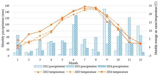 Changes in monthly precipitation and monthly average air temperature of the investigated region in 2022–2024.