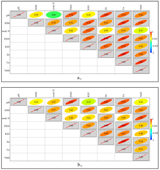 Pearson’s correlation (r values) matrix between soil chemical parameters and grain yield of rye in 2022 (a) and in 2024 (b) after harvest. Numbers in the ellipses indicate the correlation coefficients. The shape of the ellipses and the different colours according to the colour scale indicate the strength of the variables’ relationships. The angle of the ellipses indicates the direction of the correlation from the major axis. Boxed squares indicate the significance at p < 0.05. The numerical correlation matrix is provided as Supplementary Material.
