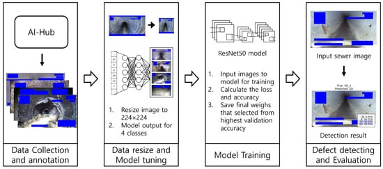 Based on sewer pipeline image data collected from AI-Hub, the images were preprocessed to a resolution of 224 × 224 pixels and used to train a CNN model for classification into four defect categories. The model architecture was built upon ResNet50, and it was designed to output classification results for each category upon receiving test image inputs. The entire process is described in detail in the following subsections.