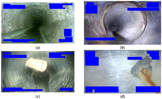 Selected classification categories for the model: (a) Non-defect—Internal (IN); (b) Joint Fault (JF); (c) Lateral Protrusion (LP); (d) Surface Damage (SD). The blue blur in each image was pre-applied to the original data to obscure textual information such as sewer location and recording time.