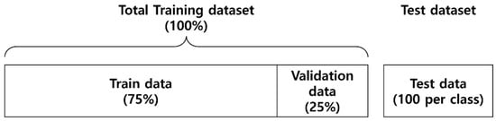 High-resolution image data used in CNN training generally provide more detailed information, which can enhance model performance. However, training with high-resolution images also increases computational complexity and leads to longer training times. Typically, CNN models are trained using images ranging in size from 128 × 128 to 256 × 256 pixels []. In this study, the images were resized into a square format to match the model’s input requirements, and the resolution was set to 224 × 224 pixels. As shown in Figure 3, 75% of the dataset was used as training data and 25% as validation data. The training dataset consisted of 10,000 images per class, totaling 40,000 images. For model evaluation, a separate test dataset was prepared with 100 images per class, totaling 400 images.