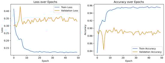 During model training, CrossEntropyLoss was employed as the loss function and Softmax as the activation function, both of which are well-suited for multi-class classification tasks. These functions enable optimal predictions by considering the probability distribution across multiple classes []. For optimization, Stochastic Gradient Descent (SGD) was utilized with a momentum of 0.9 to accelerate convergence []. To adjust the learning rate dynamically, a StepLR scheduler was applied, reducing the learning rate by a factor of 10 every seven epochs. This strategy maintained a rapid learning pace in the early stages while ensuring stable optimization in later phases []. Figure 4 visualizes the training process of the model. Training and validation steps were alternated in each epoch, and both loss and accuracy were recorded at every epoch. The final model weights were selected based on the epoch that yielded the highest accuracy on the validation dataset.