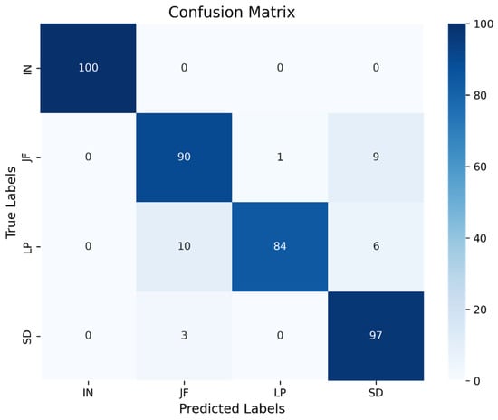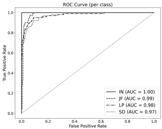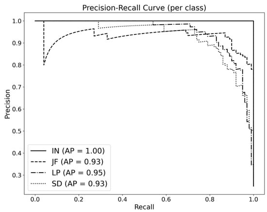 Figure 6 presents the ROC curves for each class, with AUC scores of 1.00 for IN, 0.99 for JF, 0.98 for LP, and 0.97 for SD, indicating that the model effectively distinguishes between classes. In addition, Figure 7 displays the PR curves, where the AP values were 1.00 for IN, 0.93 for JF, 0.95 for LP, and 0.93 for SD. These results demonstrate that the model maintains stable and reliable classification performance across all classes, even under data imbalance conditions, as reflected in consistently high AP values.