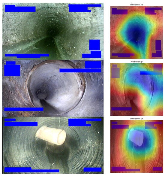 The technology for detecting sewer pipeline damage using artificial intelligence models should continue to evolve through ongoing research and development to meet future challenges and demands. The single-image-based classification approach lacks temporal and spatial context, which can lead to misclassification in cases involving multiple overlapping defects or ambiguous defect boundaries. Moreover, the ResNet50-based static classification model has limited capacity to capture and incorporate detailed information about the location and morphology of defects. To address these limitations, future work may consider incorporating video-based models that leverage temporal information or applying end-to-end object detection frameworks capable of localizing and classifying defects simultaneously. In addition, the use of explainable AI (XAI) techniques—such as Grad-CAM—can enhance interpretability and trustworthiness by visualizing the model’s decision-making process.