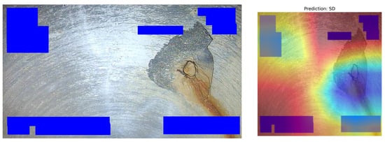 Figure 8 presents an input image (left) alongside its corresponding Grad-CAM visualization (right). In the heatmap, blue regions indicate areas where the model concentrated its attention, while red regions represent areas of lower relevance. The visualization confirms that the model focused on the actual defect areas, suggesting that it successfully learned meaningful visual features relevant to the classification task.