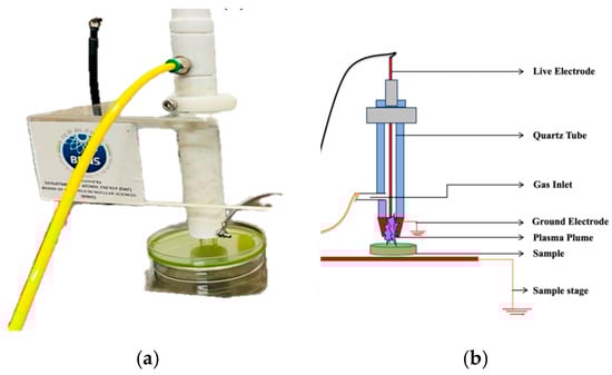 The non-thermal atmospheric-pressure plasma jet was coupled to an alternating current (AC) power source of 17 kV and 30 mA to generate the plasma using two electrodes, namely the live electrode and the ground electrode, operating at atmospheric pressure using argon (Ar) gas at a flow rate of 4 L/min. The gas was maintained at room temperature. In contrast, the electron temperature could reach around 10,000 to 100,000 K. The plasma plume was directed onto petri dishes containing Chlorella sp. culture. The microalgal cultures were kept in petri plates, one at a time, and were positioned directly beneath the plasma jet, allowing the luminous plume to encounter the surface of the culture, as shown in Figure 1. The time of discharge was controlled for each culture, with a time interval of 4, 8, 12, and 16 min, including untreated culture, which was taken as 0 min (control). A time interval of 4 min was kept between the plasma treatments (0–16 min), allowing responsive research to evaluate the impact of plasma exposure on the lipid content. The distance between the electrodes was set as 6 mm. Under these conditions, an intense plasma was formed between the two electrodes, and a luminous plume was created at the end, which reached the algal culture in the petri plate. After the plasma exposure at the set time intervals, the microalgal suspensions were collected for further analysis.