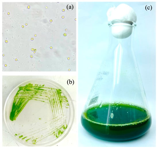 (a) Microscopic image of Chlorella sp.; (b) streaking on TAP medium agar plate; (c) microalgal broth scaled up in 500 mL conical flasks with TAP medium.