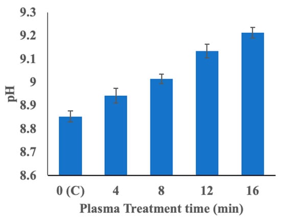 The pH of the culture medium of Chlorella sp. increased slightly from 8.852 (control) to 9.212 (16 min) after plasma treatment, as seen in Figure 3. The generation of reactive species by plasma might have led to the alkalinity of the culture. The pH increase could have impacted nutrient availability and cellular metabolic pathways, which could have resulted in the observed growth. The plasma treatment produced ammonia (NH3) and similar nitrogenous compounds, which raised the pH of the culture medium. Organic compound degradation by the reactive species produced by plasma also liberated alkaline compounds, further increasing the pH. The studies indicate that plasma can alter pH in microalgal cultures, although the direction varies depending on the plasma type and conditions. For example, some studies showed plasma pH was lowered due to acidic species, but the results aligned with a peer study where pH increased, possibly due to NTAPP effects [18].