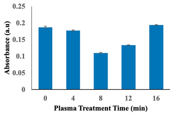 The optical density (OD) at 600 nm was measured to assess microalgal growth at different plasma exposure times, as shown in Figure 4. From the absorbance values, the short-term plasma treatment (4 min) showed a slight decrease in the microalgal growth, but this was not a significant decrease, whereas an 8 min exposure showed a significant decrease. However, prolonged plasma exposure (12 and 16 min) showed increased OD, which is due to the cell aggregation, oxidative stress, and cell damage caused by the plasma. Moreover, growth estimation by absorbance was not ideal for the plasma treatment after 8 min based on the presented data.