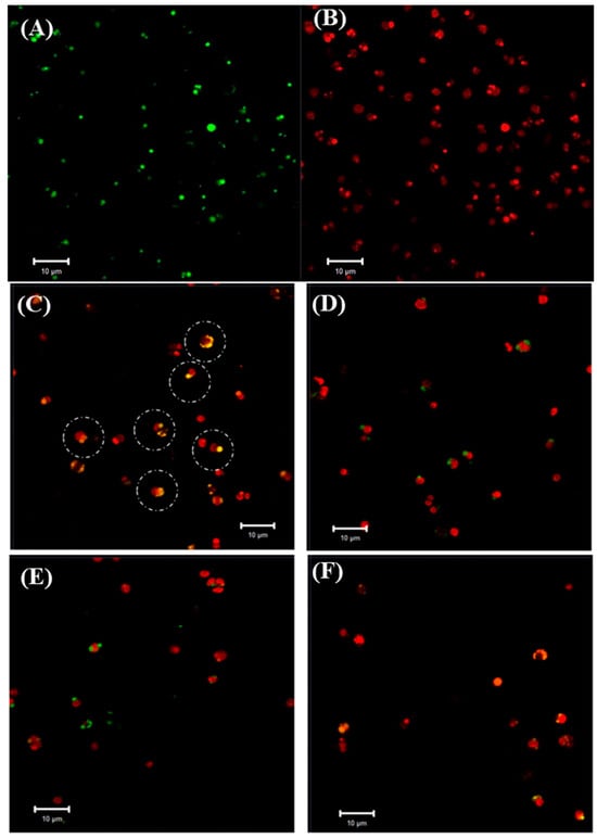 Images of lipid vesicles under non-thermal plasma. CLSM study of lipid content in Chlorella sp. with different plasma treatment times: (A,B) control (0 min); (C) 4 min; (D) 8 min; (E) 12 min; (F) 16 min.