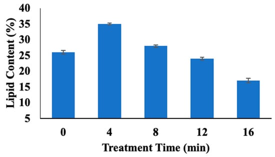 Using a non-thermal plasma combined with argon gas in atmospheric air yielded a lipid content of 35% in Chlorella sp. The lipid increment showed the benefit of the combined gases in the NTP process, and it may be related to the formation of radicals by argon ionization and the presence of atmospheric air at the gas/liquid interface. This study investigated how lipid extraction yield changed with different treatment times (0–16 min). As seen in Figure 6, the lipid yield results indicated that the 4-min treatment gave the highest lipid recovery (35%) and was higher than that of the control (26%). This suggested that the treatment time at 4 min maximized the accumulation of lipids and longer treatment durations decreased lipid biosynthesis. The decline at longer treatment times suggests potential lipid oxidation, so further research into plasma parameters such as voltage and gas composition is needed.