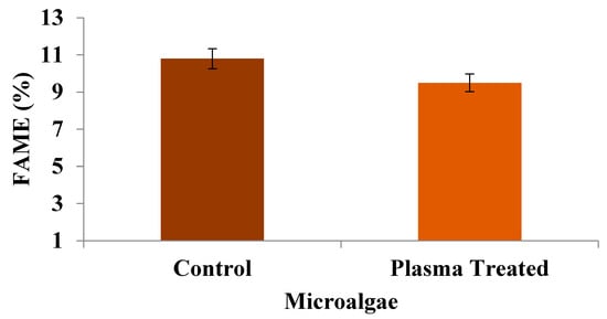 Due to their high productivity and ability to accumulate fatty acids such as omega-3 polyunsaturated fatty acids (PUFAs), microalgae are studied for their lipid content, particularly their applications in biofuels and nutraceuticals [5]. From the results observed in Figure 7, the 4-min plasma culture showed a slightly lower FAME yield (9.48%) than the control (10.76%).