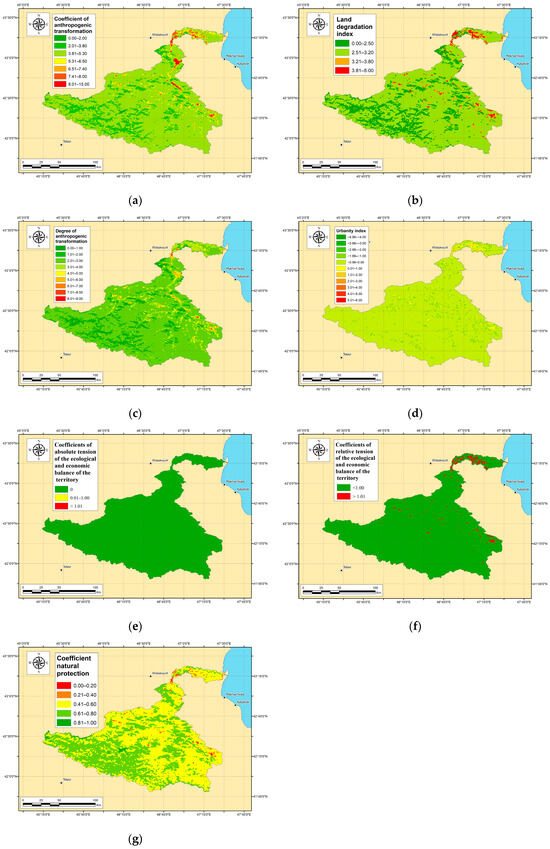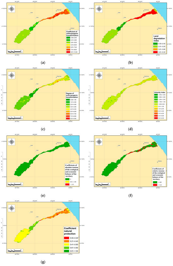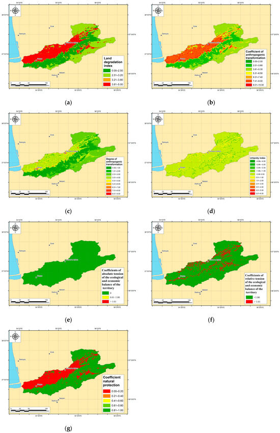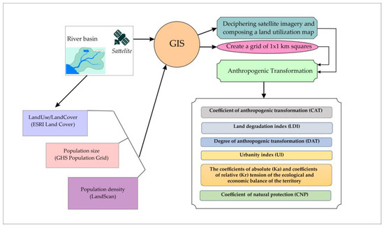 The methodology for calculating anthropogenic transformation is based on the works of [52,53]. Using QGIS 3.16 and ArcGIS 10.8, we calculated the anthropogenic transformation of the river basin territories based on the following indicators: the coefficient of anthropogenic transformation, the land degradation index, the urbanity index, the degree of anthropogenic transformation, coefficients of the absolute tension of the ecological and economic balance, coefficients of the relative tension of the ecological and economic balance, and the coefficient of natural protection. These indicators are used to show the transformation of the landscape, and as such, the calculated values of the coefficient of anthropogenic transformation range from 0 to 10, representing a gradient from the least to the most transformed landscapes [53]. This index has been used in a large number of studies [51,52]. The land degradation index, also referred to as the index of anthropogenic alteration of lands, is employed to assess human-induced changes in landscapes. It utilizes modern technologies and methods to promote rational land use for maximum economic and social benefit. The degree of anthropogenic transformation is used to analyze the structural and functional characteristics of natural (or “restored”) landscapes, and also to analyze their anthropogenic transformation [51], aiding in the creation of zoning maps [54], among other applications.