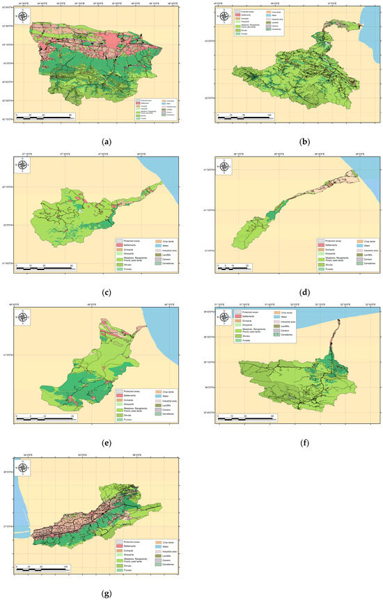 From a practical perspective, understanding the scale and trends of anthropogenic transformation in the basins of small- and medium-sized rivers is crucial for effective landscape forecasting and developing sustainable management strategies. However, these basins face significant challenges, including soil degradation, loss of biological and landscape diversity, altered water runoff patterns, and increased vulnerability to climate change due to intensified human activities such as agriculture, urbanization, and industrialization. This pressure threatens ecosystem functionality and the achievement of the United Nations Sustainable Development Goals (SDGs), particularly in water-scarce regions like the Caspian Sea basin. This study presents an innovative approach to addressing these challenges by leveraging advanced remote sensing and GIS technologies to analyze land use and quantify anthropogenic impacts in the Sunzha, Sulak, Ulluchay, Karachay, Atachay, Kharaz, and Gorgan River basins. Its innovative aspects include focusing on understudied Caspian Sea basins, quantifying anthropogenic impacts, and supporting sustainable management based on integrated remote sensing and GIS analysis. This study aims to analyze nature management, examine territory surface data using remote sensing methods, and quantify the anthropogenic transformation of the following Caspian Sea river basins: Sunzha, Sulak, Ulluchay, Karachay, Atachay, Haraz, and Gorgan.