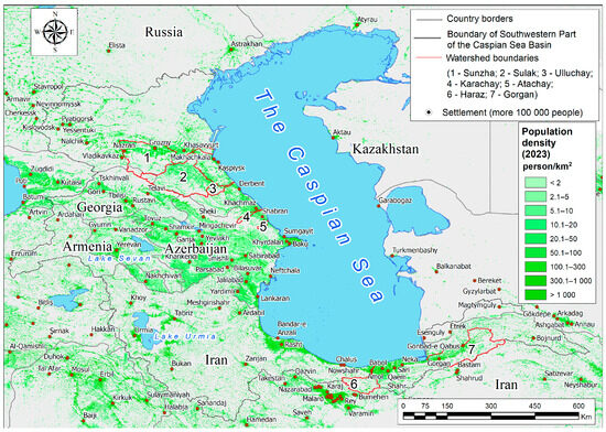 This study investigates the anthropogenic transformation of small- and medium-sized river basins within the Caspian Sea catchment. The basins of seven rivers—Sunzha, Sulak, Ulluchay, Karachay, Atachay, Haraz, and Gorgan—were selected as key study areas. For both the broader Caspian region, particularly its southwestern sector, and the selected study sites, trends in land cover types were analyzed, natural resource use practices were assessed, and population density dynamics were examined. Furthermore, a range of indices were calculated to quantify the degree of anthropogenic transformation, including the coefficient of anthropogenic transformation, the land degradation index, the urbanity index, the degree of anthropogenic transformation, coefficients of absolute and relative tension of the ecological and economic balance, and the natural protection coefficient. The study was conducted using geoinformation research methods and sets of geodata databases—the global LandScan population density database, the GHS Population Grid database, the ESRI land cover type dynamics database, and OpenStreetMap (OSM) data. The analysis was performed using the geoinformation programs QGIS and ArcGIS, and a large amount of literary and statistical data was additionally analyzed. It is shown that within the studied region, there has been a decrease in the number and density of the population, as a result of which the territories of river basins are experiencing an increasing anthropogenic impact, the woody type of land cover is decreasing, and the agricultural type is increasing. The most anthropogenically transformed river basins are Karachay, Haraz, and Gorgan.