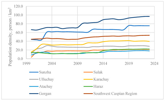 The collected data on population size, population density, land cover type dynamics, and land use were uploaded into a GIS and visualized using standard methods described in studies [43,44,45,46,52]. Subsequently, geographic maps were created. The data on the boundaries of the river basins under study were obtained from work [42].