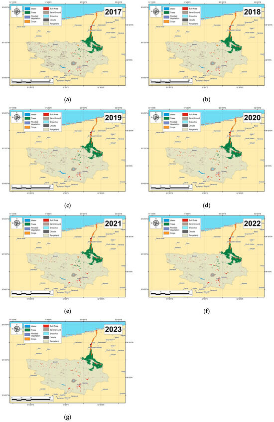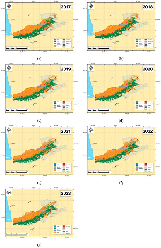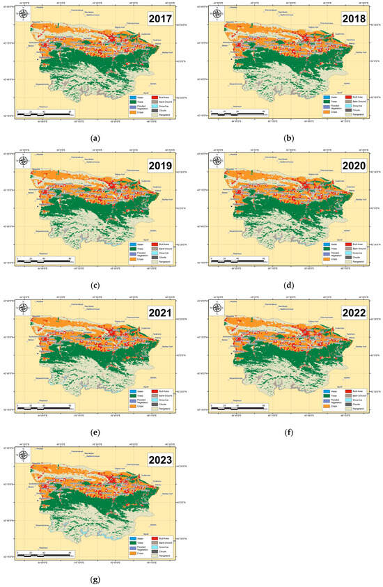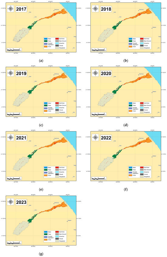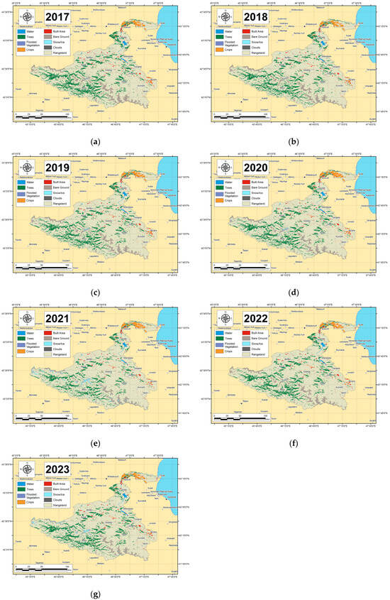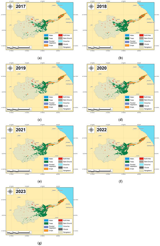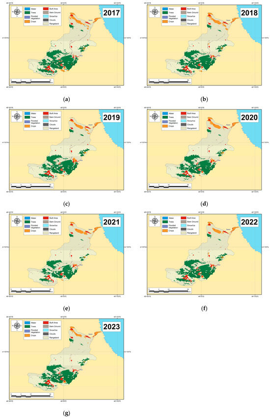 Land cover data, consisting of raster images spanning from 2017 to 2023, were sourced from the ESRI Land Cover database. We selected this database primarily because of its high spatial resolution compared to similar datasets. Raster images were downloaded from the official ESRI Land Cover database website [50] and subsequently visualized and analyzed using ArcGIS.