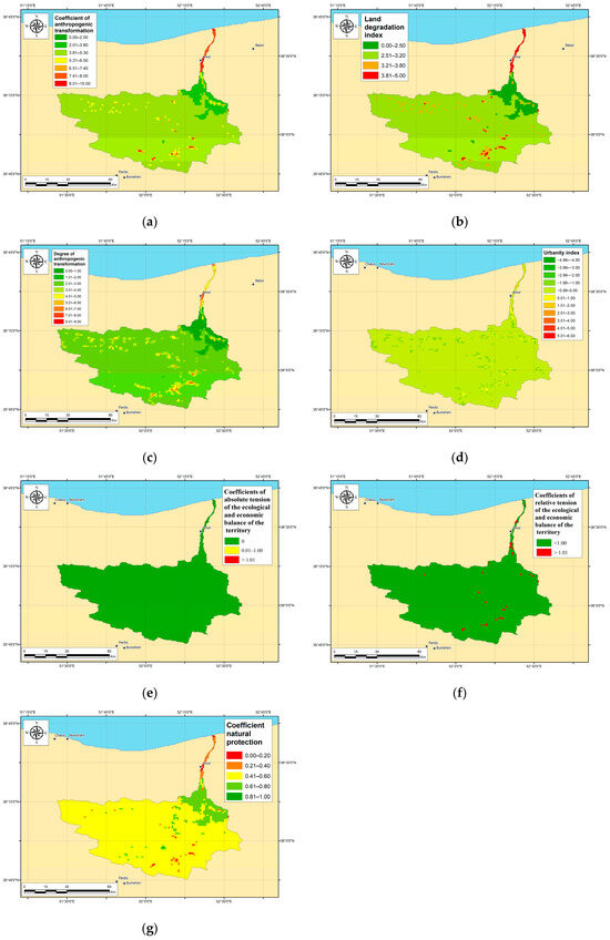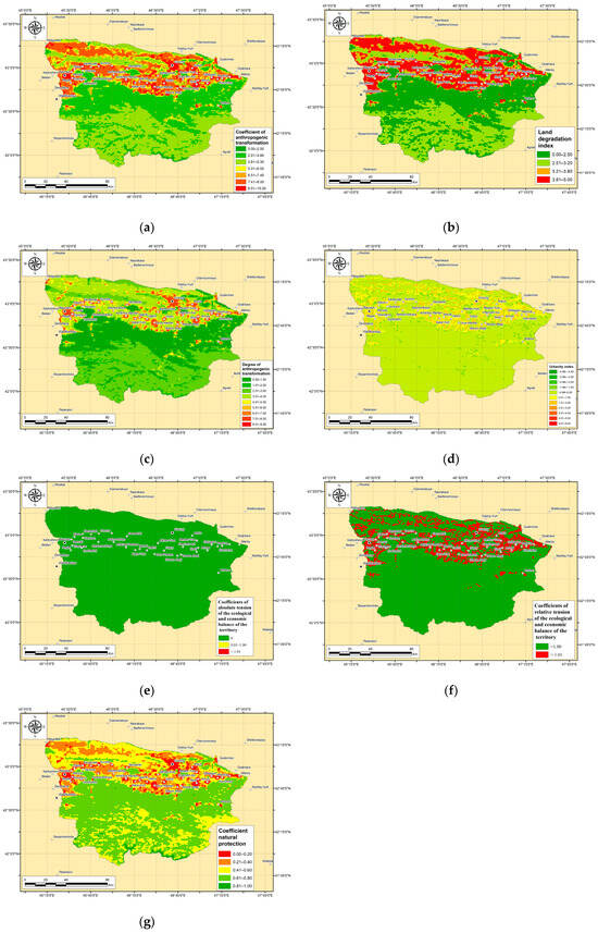 B.I. Kochurov [49] developed a methodology for the comprehensive assessment of a territory’s ecological–economic state. The analysis of the ecological–economic state using the coefficient of absolute tension helps to balance significant anthropogenic impacts with landscape restoration potential, though spatial differences in this coefficient may not be particularly pronounced. The coefficient of relative tension provides a more precise analysis of the ecological–economic state than the absolute tension coefficient because it integrates intermediate indices of anthropogenic load. The coefficient of natural protection is used to evaluate the stability of a territory under low anthropogenic loads [55]. Therefore, given the increasing and spatially varying external pressures on the environment, studying the impact of anthropogenic influence on landscapes is of critical importance [52].