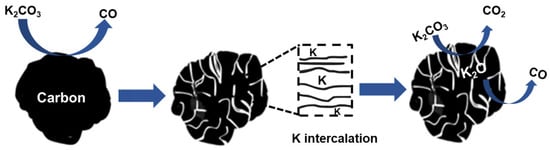 In the activation process, two main activating mechanisms took place. The first is based on the porogenic action of K2CO3 according to reactions presented in Equations (1)–(4) [23]. In the reaction in Equation (1), carbon is oxidized to CO, creating voids in the process. It is noteworthy to mention that the element potassium has the ability to intercalate within the carbon layers disrupting the internal structure of the carbon matrix, thereby generating additional pores and voids in the carbon precursor [28]. At temperatures reaching up to 800 °C, the reaction in Equation (2) occurs where K2CO3 slowly decomposes, and CO2 further reacts with C according to the reaction in Equation (3), also creating more pores or enlarging existing ones. A schematic diagram of the activating process is presented in Figure 1.