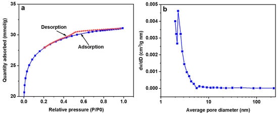 The surface characteristics of CAC were attained from the N2 adsorption/desorption isotherms and presented in Figure 2. The N2 isotherms observed in Figure 2a suggest a type II characteristic, which according to the IUPAC classification convention is a mesoporous system [30]. For further confirmation, Figure 2b illustrates the average pore size distribution, which falls within the mesopore range (the average pore diameter is 2–3 nm) [31].