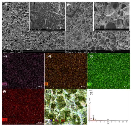 Figure 3. SEM analysis of WS carbonized at 800 °C without chemical impregnation (a) and after chemical impregnation with Na2S2O3 and K2CO3 (CAC) (b). EDX element mapping of Na (c), K (d), S (e), Hg (f), and total elements after adsorption (g); EDX spectrum after adsorption (h).