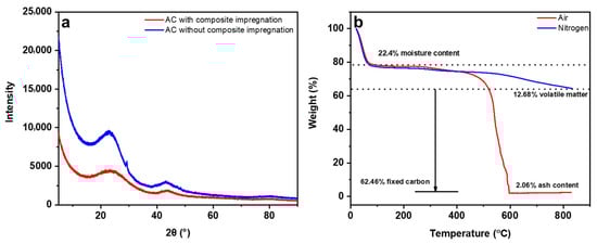 Two XRD patterns referring to AC without chemical impregnation and CAC (IR 1:1:2) are presented in Figure 4a. Activated carbon (CAC) is predominantly made up of amorphous carbon, which has a disordered structure. As a result, XRD patterns of AC typically do not exhibit distinct diffraction peaks [33]. The XRD patterns illustrate two distinct peaks at 25° and 44°, which correspond to the (002) and (101) reflections of the AC material, respectively. It is noted that the intensity of the peak after impregnation has decreased and broadened in comparison to the peak pertaining to AC without chemical impregnation, indicating a reduction in the crystallinity of AC post chemical impregnation. The thermal decomposition behavior of CAC was assessed and presented in Figure 4b. From the TGA plot, volatile matter, fixed carbon, ash content, and moisture content were determined and displayed in Table 2. AC is characterized by low ash content and high fixed carbon content, which is evident by 2.06% low ash content and 62.46% carbon content in CAC. From the TGA plots, the first mass loss took place starting at 105 °C due to the vaporization of moisture as CAC may absorb water. The second mass drop is due to thermal decomposition of the sample between 200 and 600 °C. From a thermal stability point of view, CAC exhibited a high thermal stability as the mass remained almost constant until 600 °C, after which a slight decrease in carbon content was observed.
