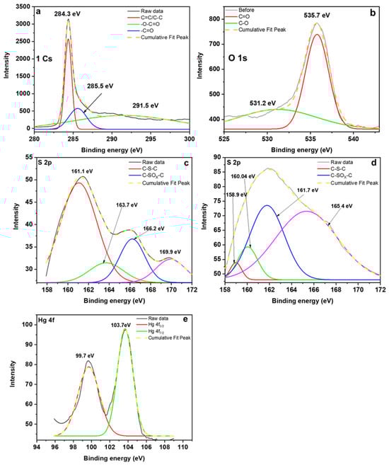 The XPS technique was utilized to examine the binding energy and chemical composition of CAC. Figure 5 shows high-resolution XPS spectra of C 1s, O 1s, S 2p, and Hg 4f. Figure 5a revealed that the major peak at 284.5 eV in C 1s consists of the following groups: carbonyl groups (287.7–289.0 eV), carboxyl group (2891.5–292.3 eV), and aromatic/graphitic groups (285.3–285.4 eV) [34]. The major peak in O 1s consists of oxygen in carbonyl (530.1–530.6 eV) and carboxylic groups (533.7–533.8 eV) [34]. The high resolution of S 2p plot exhibits two doublets, the lower and high intensity doublet. The lower doublet is attributable to sulfur from thiophene groups (164.2 and 165.4 eV) and the high intensity one refers to oxidized sulfur (168.1 and 169.3 eV) [29]. The mercury adsorbed onto CAC showed two district peaks at 99.7 and 103 eV which indicate that mercury is in Hg2+ oxidation state.