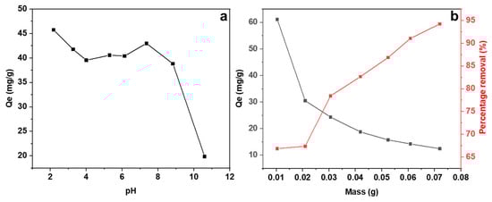 The pH of the solution plays a crucial role in the adsorption of mercury. The impact of pH variation on adsorption has been examined across a pH range of 2 to 11 and is displayed in Figure 6a. According to the diagram, Qmax was observed at pH 2. There was a slight decrease in adsorption capacity between pH 3 and 4, and from pH 4 to 8, the adsorption capacity remained constant. However, a significant decrease occurred at higher pH levels. These results demonstrate that the process of removing mercury is highly efficient when the pH level is between 2 and 8. This result indicates that electrostatic attractions do not play a role in the adsorption mechanisms. This is because low pH values result in the presence of hydronium ions that act as barriers and compete with mercury ions for adsorption sites thus leading to poor uptakes of mercury. The significant decline in removal in the alkaline zone is related to the prevalence of Hg(OH)2 as the main mercury species at high pH levels [35].