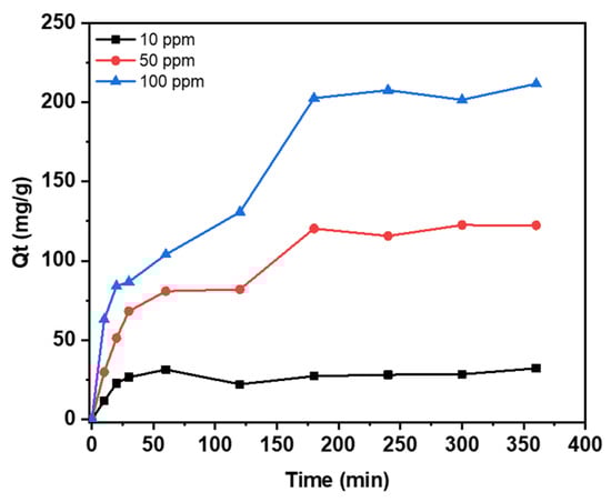 The study examined the adsorption of mercury ions at various initial concentrations (10, 50, and 100 ppm) and analyzed the results in Figure 7. It was observed that it took around 4 h for equilibrium to reach at all three different initial concentrations. It was also noted that the rate of removal increased at the higher initial concentration of mercury. A rapid removal occurred within the first hour where 60–70% of mercury was removed reaching almost 50% of the maximum adsorption capacity and then gradually reaching a plateau. The early stage is characterized by a quick removal process, which can be attributed to the abundance of accessible vacancies for adsorption. Subsequently, a gradual rise is observed as these sites become occupied [36]. Figure 7 illustrates that the effectiveness of removing mercury ions is dependent on the initial concentration of mercury. The adsorption capacity increases as the initial concentration of mercury increases. These results are similar to the results reported by Zhu et al. [37].