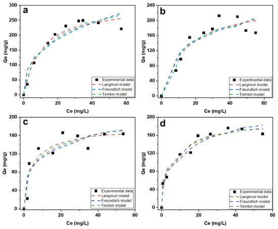 Three adsorption isotherms were used to investigate the processes of adsorption between mercury ions and CAC. The adsorption isotherms, namely the Langmuir model, Freundlich model, and Temkin model, are expressed as non-linear Equations (A3)–(A5), respectively [26,27].