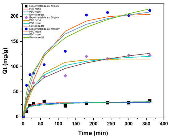 The kinetics data were fitted using pseudo-first order (PFO), Pseudo-second order (PSO), and Elovich model and are denoted as Equations (A6)–(A8) respectively [28].
