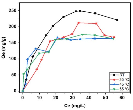 The mercury adsorption isotherms are given in Figure 8 and were performed at four different temperatures. Table 3 lists all adsorption parameters for all temperatures. From Table 3, the experimental data fits the Langmuir model very adequately according to the relatively high R2 values and low χ2 and RSME values. The maximum adsorption capacity was determined and found to be 289 mg/g. This shows that the distribution of mercury ions over CAC follows the monolayer adsorption distribution profile over a homogenous surface [38]. According to Treybal, if the values of n lie between 1 and 10, this is an indication that the adsorption of mercury onto CAC is favorable [39]. In addition, a dimensionless constant known as the separation factor and denoted by RL, defined by Webber and Chakkravorti, was calculated for all four temperatures and the values are between 0 and 1, indicating that the adsorption process is also favorable [40]. Sajjadi et al. reported the use of AC prepared from pistachio shells for the adsorption of mercury ions [15]. The removal of mercury ions also followed the Langmuir isotherm model.
