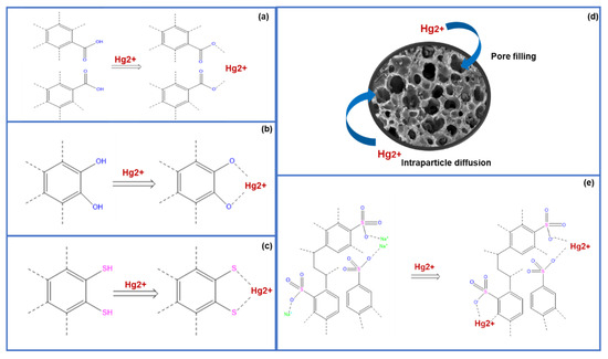 Figure 11. Suggested mechanisms for the removal of mercury using CAC. The removal of mercury through a carboxylic group (a), a phenolic group (b), and sulfur-containing functional groups (ce). The removal of mercury through the pore-filling mechanism.