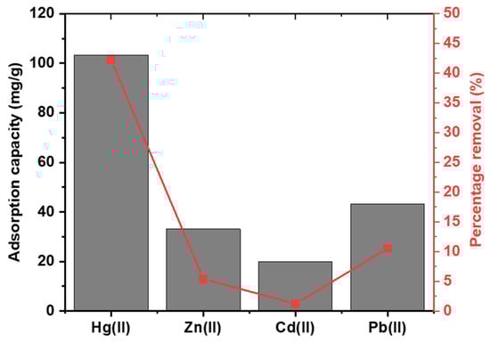 Figure 12 illustrates the impact of additional heavy metal ions on the solution. The adsorption capacities in descending order are Hg2+ at 103.3 mg/g, Pb2+ at 43.2 mg/g, Zn2+ at 33.03 mg/g, and Cd2+ at 19.78 mg/g. Mercury was removed by approximately 45%, whereas the other ions had significantly lower removal percentages. The strong affinity for mercury is due to the sulfur-containing functional groups effectively trapping mercury ions from the solution. Lead ions exhibited the highest adsorption capacity and percentage removal after mercury, and this is attributed to the fact that lead ions have a high affinity towards oxygen-containing functional groups, allowing the formation of complexes on the surface of CAC. Essentially, this test demonstrates that the presence of other heavy metal ions in the solution has minimal impact on the removal of mercury from the solution using CAC.