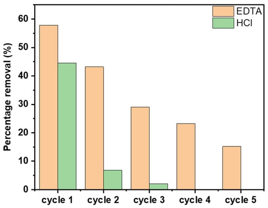 Regeneration studies were conducted using two chemical effluents including HCl and ethylenediaminetetraacetic acid (EDTA), and the results are presented in Figure 13. The results demonstrate CAC’s high degree of recyclability. As more cycles were performed, the percentage removal decreased in comparison to its original value. A 20% removal was attained by the absorbent after five cycles. EDTA is an excellent chelating agent, especially for divalent ions due to its ability to form stable complexes with these ions [54]. This strong binding affinity makes it effective at removing heavy metal ions. In contrast, HCl performed poorly as it was only able to retain about 5% of percentage removal after only three cycles.