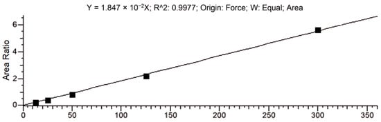 Each batch of samples was analyzed once for the middle concentration point of the standard curve, and the measured result had a relative deviation ≤ 20% compared to the initial curve’s measured concentration at that point. During the sample testing process, a spiked recovery experiment was performed, and the results indicated that the spiked recovery rates ranged from 91% to 108%. In this study, the concentrations of o-cresol, m-cresol, and p-cresol in the water were quantitatively determined individually. Subsequently, the detection results for these three components were aggregated to calculate the total cresol content data. Information on the ion pairs used for multiple reaction monitoring is presented in Table 1. Based on the measured data, a standard curve for phenolic contaminants was created, as seen in Figure 2.