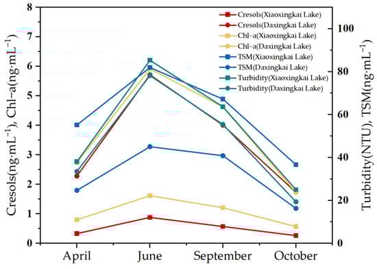 - The concentration range of cresols in the water column of Lake Xingkai was between 5.91 × 10−1 and 6.68 ng·mL−1. The concentration of cresols in the water of Xiaoxingkai Lake was generally higher than that in Daxingkai Lake.