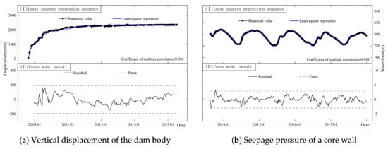 Dam safety monitoring data can obey different rules and can have various types. Property changes in the dam and foundation, equipment-induced short-term abnormal values, significant environmental changes associated with seismicity, construction activities and loadings, etc., would affect patterns of data sequences [18]. The most common patterns observed in monitoring values typically include periodic changes, one-way trend changes, and horizontal linear changes. These patterns can be influenced by various factors such as seasonal variations, long-term structural behavior and stable operational conditions. Anomalies like outliers, small-value data, step-type and oscillatory-type data are also prevalent in monitoring sequences related to dam deformation, seepage and stress. Identifying these anomalies is crucial for maintaining the reliability and accuracy of dam safety assessments. It can be seen in Figure 1 and Figure 2 that these models are ideal for the data sequences with large sample sizes, normal distribution, moderate values and a small number of outliers.