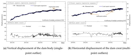 For historical sequences with outliers, Erdoğan [14] employed the double-weight estimation in M-estimation to identify anomalous values when studying the effect of reservoir water level changes on dams and achieved satisfactory results. Wang et al. [15] proposed a Kalman filtering algorithm-based M-estimator for deformation monitoring in concrete gravity dams. The MZ criterion, short for median-based Z-score criterion, is defined as , where “MAD” represents the median absolute deviation. This robust statistical approach minimizes the influence of outliers on threshold determination. The influence of abnormal observations and dynamic disturbance on monitoring data was controlled. Touati and Benaraba [16] proposed a robust inversion method for jointly estimating parameters and variance components from heterogeneous monitoring data. This method can effectively deal with outliers in dam monitoring data and obtain reliable estimations. In 2019, Wei et al. [17] proposed an improved quantile method for anomaly identification. The method showed high accuracy in the recognition of outliers. In general, the mathematical model identification method based on the Pauta criterion is most commonly used in the online identification of abnormal dam safety monitoring data because it can not only reflect the influence of environmental variables in a comprehensive manner but also is easy for calculation and programming without a loss of reliability.