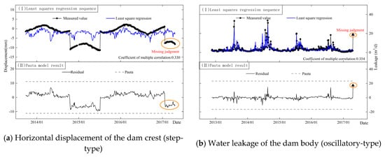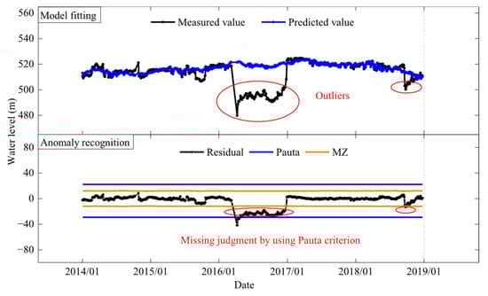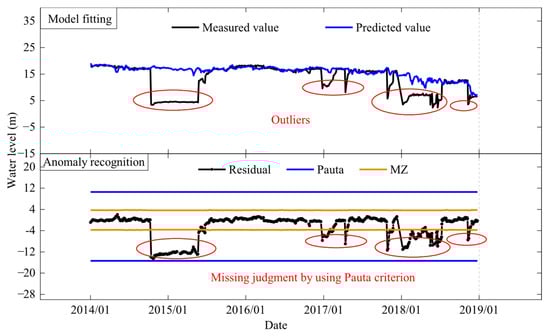 In previous research, the MZ criterion was confirmed to exhibit lower false positive and false negative rates compared to M-robust regression [18]. This characteristic is also demonstrated in its comparison with the Pauta criterion. Table 1 and Table 2, respectively, show the anomaly identification results of the two mathematical models based on the Pauta criterion and the MZ criterion in the safety monitoring data of GZ and TJZ dam. It can be seen from Table 1 that the model based on the Pauta criterion caught 12 abnormal mutation points and missed 17 mutation points. About 342 anomalies were caught, 1316 anomalies were missed and 6 anomalies were misjudged. The overall misjudge-and-omission rate was up to 2.48%. Misjudgments and omissions mainly exist in seepage sequences that were usually step-type and oscillatory-type, as shown in Figure 17 and Figure 18. For single observation points, the false and missing alarm rate is as high as 10%, as shown in Table 2.