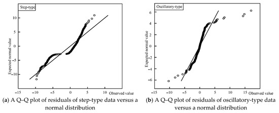 (b) Data sequences or residual sequences significantly deviate from the normal distribution assumption of the Pauta criterion. Generally, the anomaly identification methods based on the Pauta criterion are resistant to sequences with a proportion of outliers less than 5%. But the proportion of outliers in step-type and oscillatory-type data sequences is relatively larger. The presence of a large number of outliers would make data sequences and residual sequences deviate significantly from the normal distribution assumption of the Pauta criterion. The Q–Q plot is a graphical method for comparing two distributions. The points in the Q–Q plot will approximately lie on the line y = x if the two distributions being compared are similar. For illustrative purposes, the normality of the residuals of step-type and oscillatory-type data in Figure 3 were tested by a Q–Q plot, and the results were shown in Figure 4. It is obvious that both residual sequences do not satisfy the normal distribution. Thus, it is unreasonable to use the Pauta criterion to set an early warning threshold for non-normally distributed residuals.