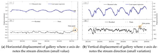 Due to the characteristics of response data, monitoring instrument modification, instrument range adjustment, etc., “small-value” observations are common in dam safety monitoring. The “small-value” observations usually have small monitoring values and small variations, such as observations of fractures and dislocations. This type of data sequence can be well fitted by a least squares regression. However, the magnitude of the estimation error is close to or even larger than the early warning threshold of the Pauta criterion. Therefore, the estimation error between the sample and the population cannot be ignored. The Pauta criterion does not take into account this estimation error, which would result in a small-value early warning threshold and cause misjudgments of normal values, as shown in Figure 5.