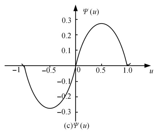 Different types of M-estimators have been proposed by Huber [22], Andrews and Hampel [23], Hampel [24] and Tukey [25]. The estimation of the Huber M-estimator is close to the sample average, but its robustness is inadequate. The derivative function of the objective function of the Hampel regression estimator is complicated and rarely applied in practical engineering. The Andrews estimator and the Tukey double-weight estimator divide the measurement interval into an elimination area and a useful area and are widely used in various fields. The Tukey M-estimator was selected in this paper because of its wider derivative function of the objective function and strong resistance. The objective function and weight function of the Tukey M-estimator are shown in Figure 6 and Figure 7, respectively. The objective function of the Tukey biweight estimator is denoted as ρ(u). Among various types of M-estimators, the Tukey biweight estimator stands out due to its strong resistance and smooth objective function. Its objective function ρ(u) and weight function are defined as follows: