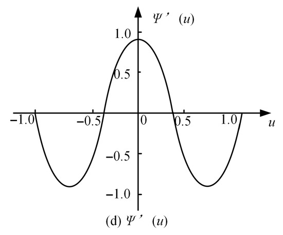 To further understand the properties of the Tukey biweight estimator, we introduce the first and second derivatives of the objective function, and , which play important roles in the estimation process and provide insights into the behavior of the estimator. Figure 8 and Figure 9 illustrate the graphical representations of and , respectively.