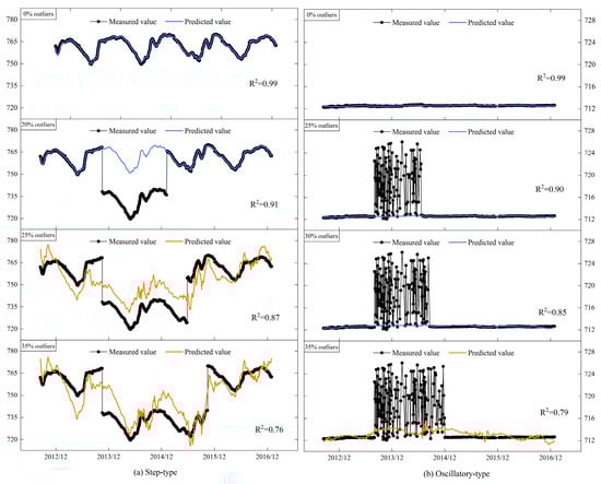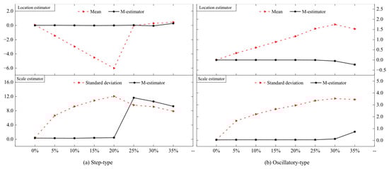 To further investigate the sensitivity of the robust regression model and the M estimator to outliers, we took two sets of observations for analysis; one was periodic, while the other was relatively stable. Outliers were added to make the proportion of outliers be 5%, 10%, 15%, 20%, 25%, 30%, and 35%. The results are shown in Figure 10. Figure 10 includes R2 values for curves, demonstrating that the MZ criterion maintains high goodness-of-fit (R2 > 0.75) even in datasets with substantial outliers. The results show that the robust regression model can maintain good robustness when confronting step-type outliers up to 25% and oscillatory-type outliers up to 30%. This indicates that the model has a significant advantage in processing data sequences with substantial outliers. The stability and tolerance of the M-estimator are better than that of the least squares estimator under different proportions of outliers. If the data sequences do not contain outliers, the two estimators can obtain similar results. As the number of outliers increases, the mean and standard deviation of the least squares estimates deviate further from their true levels, while the M-estimator can tolerate the perturbation of about 20% of the outliers, as shown in Figure 11. In field applications, the outlier proportion can be monitored via moving window MAD calculations. When >20% of windows exhibit abnormal MAD values, data segmentation is recommended to maintain threshold accuracy.