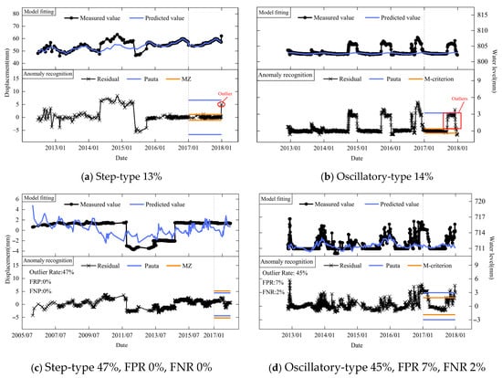 Therefore, for both observation point groups and single observation points, the identification method based on the MZ criterion can maintain a low false and missing alarm rate and a high recognition accuracy, especially for the step-type and oscillatory-type data sequences that often occur in dam safety monitoring data.
