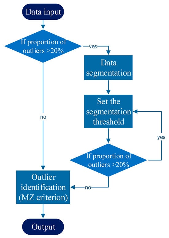Based on the statistical analysis, the MZ criterion proposed in this paper can resist the influence of outliers within 20% and has good resistance and robustness, as shown in Figure 12a,b. Figure 12c,d display quantitative indicators, showing that the MZ criterion achieves 7% error rates even at 45% outliers, significantly outperforming traditional methods with >20% error rates. However, if the proportion of outliers is too large, both the robust estimation model and the MZ criterion will fail, as shown in Figure 12c,d. Then, we can divide sequences into segments and set the early warning threshold separately in order to improve the accuracy of the identification model. The flowchart for outlier identification is shown in Figure 13.