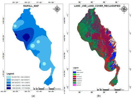 Study area characteristics: (a) rainfall (mm), (b) land use and land cover.