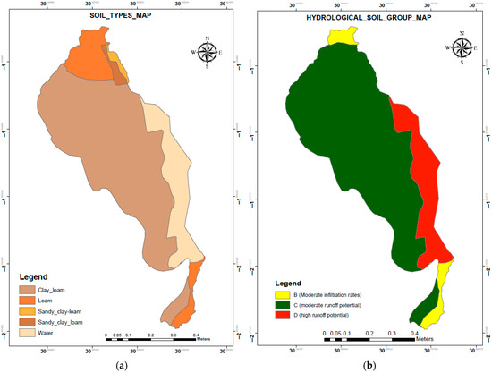 Most of the soil in the study area can be classified as HSG C, (Figure 6b), indicating that the dominant soil type can absorb water, leading to moderate runoff potential. The HSG C is concentrated along the central and eastern parts, meaning these areas have lower infiltration rates and are more likely to contribute to surface runoff. Meanwhile, HSG B is found in small patches, mainly at the northern and southern edges, indicating poor infiltration and high runoff potential. Hydrological soil groups (HSGs) play a critical role in runoff generation and watershed management by categorizing soils based on infiltration rates [72]. They are classified into four groups, A (high infiltration) to D (very low infiltration)). HSGs influence the Soil Conservation Service Curve Number (SCS-CN) method, a widely used approach for estimating runoff. Studies show that areas dominated by HSGs C and D have higher runoff potential due to lower infiltration capacities [72].